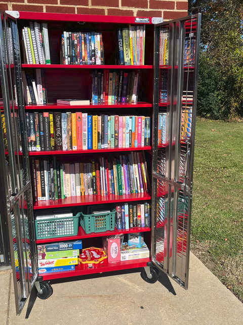 shopping outside.  We now have a rolling cabinet that will reside outside our doors during our open hours (Wednesday, Friday, and Saturday from 10-2), weather permitting.  Inside the cabinet you will find a selection of books, DVDs, music CDs, puzzles and games for purchase. We accept cash, checks and credit cards – just pay one of our volunteers..  Please do come by and check it out!