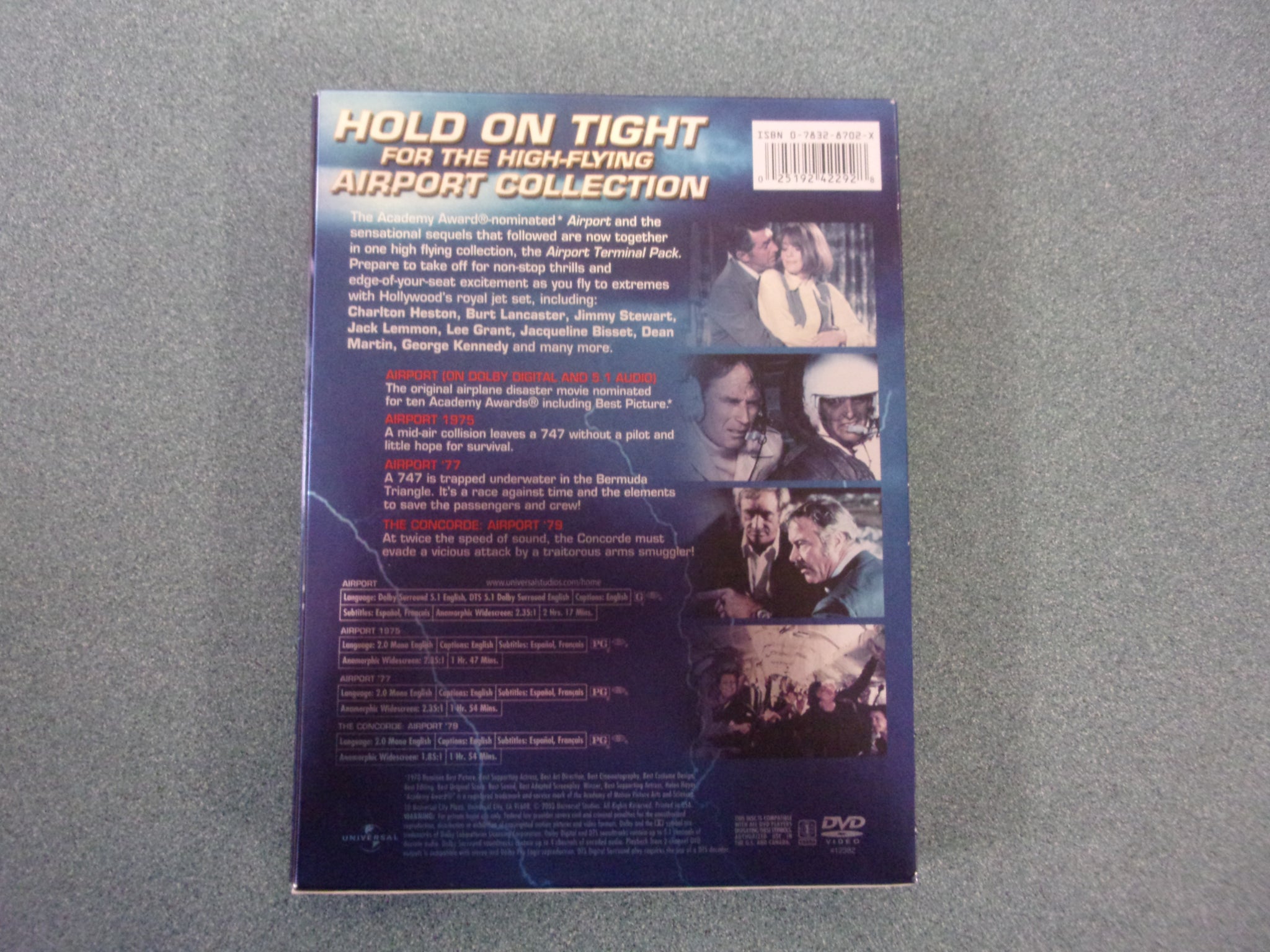 The Academy Award-nominated Airport and the sensational sequels that followed are now together in one high flying collection, the Airport Terminal Pack. Prepare to take off for non-stop thrills and edge-of-your-seat excitement as you fly to extremes with Hollywood's royal jet set, including: Charlton Heston, Burt Lancaster, Jimmy Stewart, Jack Lemmon, Lee Grant, Jacqueline Bisset, Dean Martin, George Kennedy and many more.AirportThe original airplane disaster movie nominated for ten Academy Awards including Best Picture.Airport 1975A mid-air collision leaves a 747 without a pilot and little hope for survival.Airport '77A 747 is trapped underwater in the Bermuda Triangle. It's a race against time and the elements to save the passengers and crew!The Concorde: Airport '79At twice the speed of sound, the Concorde must evade a vicious attack by a traitorous arms smuggler!