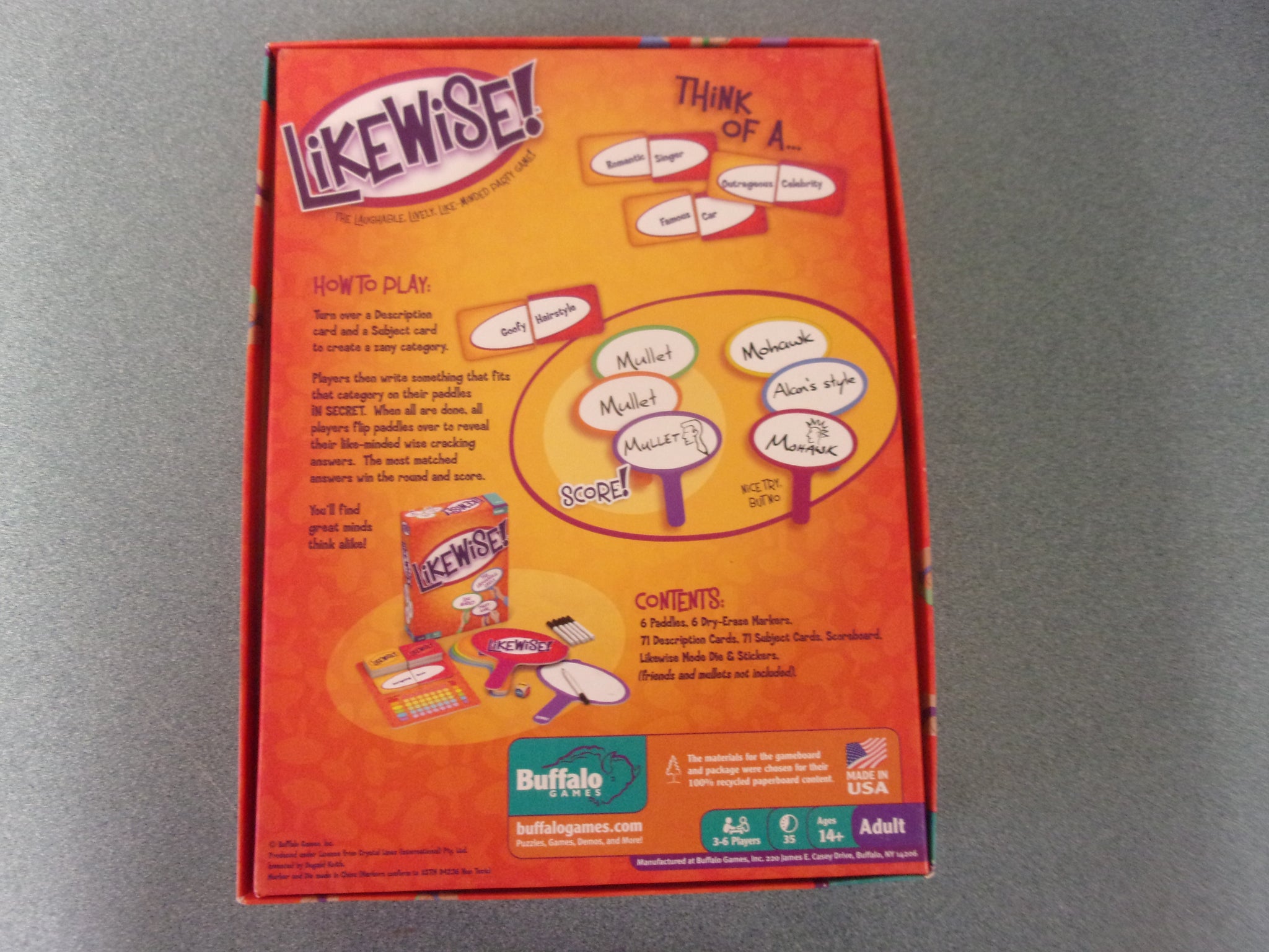 - A lively party game where it pays to think alike! Players combine a “description” card and a “subject” card to create a category like “Goofy” “Hairstyle.” Players write something that fits that category and the most matched answer wins the round!