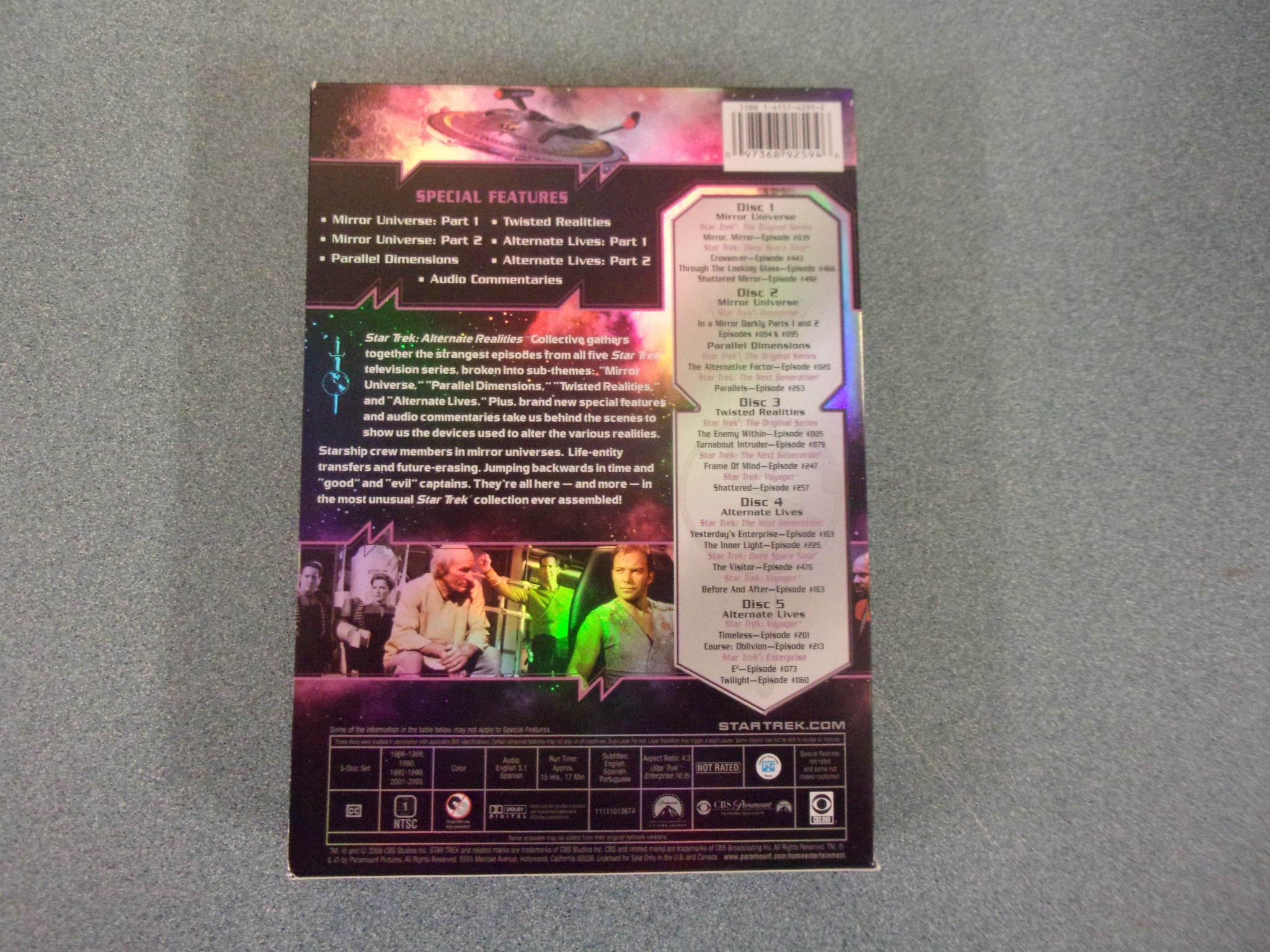 Star Trek Collective: Alternate Realities is the sixth entry in the Star Trek: Fan Collective series (but not named as such, presumably because these episodes weren't selected by fan vote), and it's a good one. The categorization can be a bit random and anyone could argue about the selections, but it's a good all-around sampler collection from all five live-action series with some all-time-classic episodes (sorry, no Animated Series here, though "Yesteryear" or "The Counter-Clock Incident" would have fit). It starts with six episodes from the "Mirror Universe," in which crew members become their psychological opposites and Spock has a beard in "Mirror, Mirror," and in which Deep Space 9 ("Crossover," "Through the Looking Glass," "Shattered Mirror") then Enterprise ("In a Mirror Darkly, Parts 1 and 2," melding the Original Series' "Mirror, Mirror" and Tholian Web episodes) made memorable visits. The next category is "Parallel Dimensions," and in the Original Series episode "The Alternative Factor," Kirk meets two different versions of Lazarus. That's followed by the final-season Next Generation episode "Parallels," in which Worf bounces back and forth among various crew scenarios. The third category, "Twisted Realities," finds two contrasting-personality versions of Kirk in "The Enemy Within" and then his body is taken over by Janice Lester in the final episode of the Original Series, "Turnabout Intruder." That's followed by TNG's "Frame of Mind," in which Riker seems to jump between the ship and a mental hospital, and "Shattered," in which Chakotay experiences numerous stages of Voyager's past.